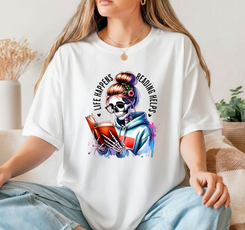 Life Happens Reading Helps Skeleton Book – Booktrovert DTF Transfer
