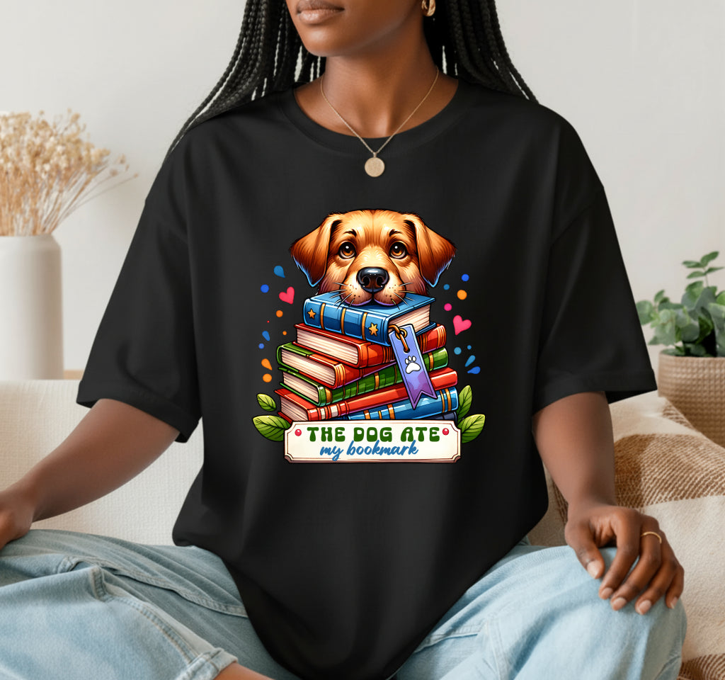 Celebrate your love for books and pets with this unique 'THE DOG ATE MY BOOKMARK.' DTF transfer. Featuring a charming dog amidst books, it's a playful nod to common reading mishaps. Ideal for book club members, librarians, or dog owners looking for a fun, ready-to-press design to personalize apparel and accessories.